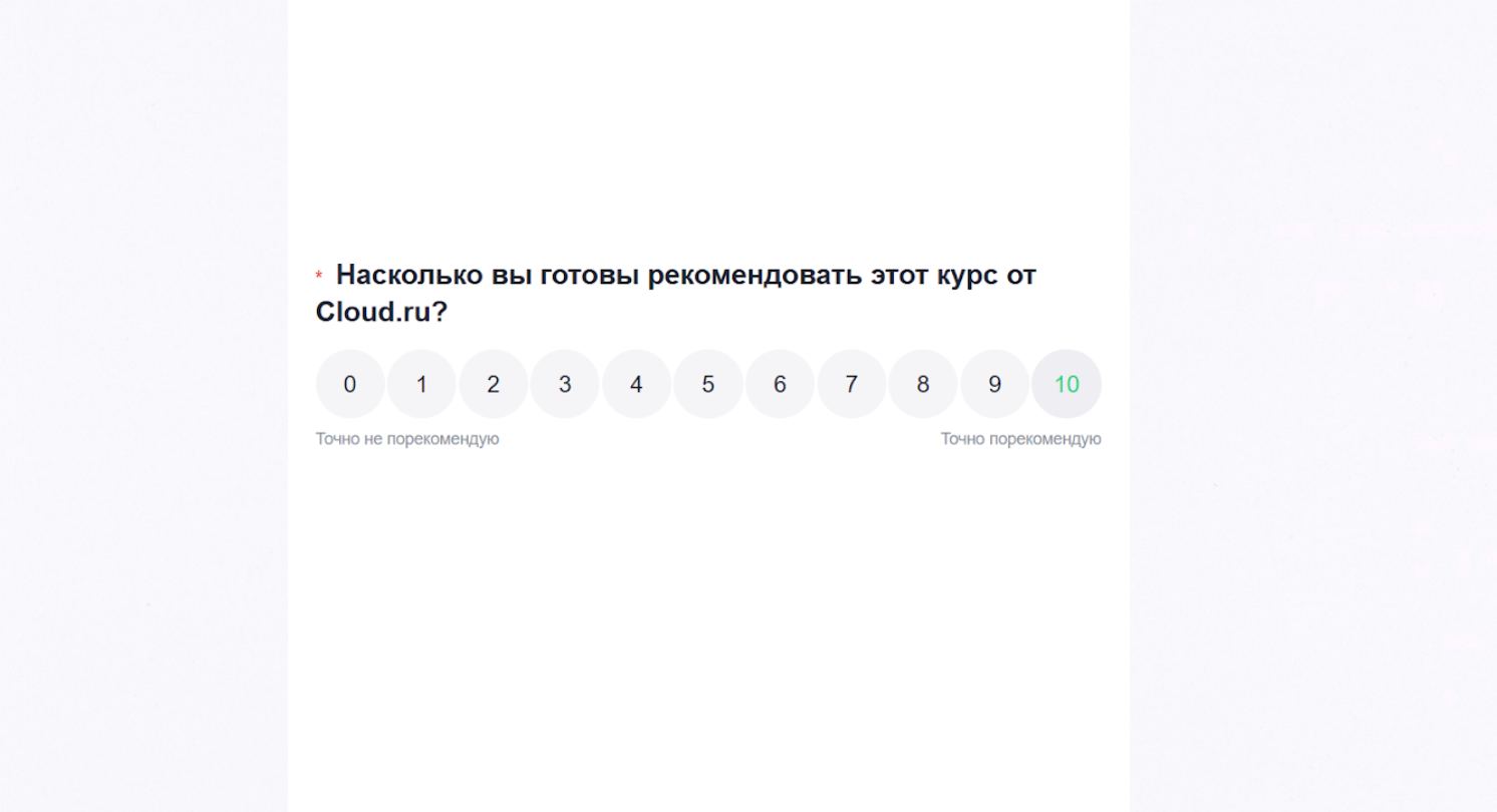 Во-первых, нам важно измерять NPS по результатам курса. Готовы ли пользователи после прохождения нашего обучения рекомендовать курс от Cloud.ru. Здесь мы использовали классическую NPS-шкалу.