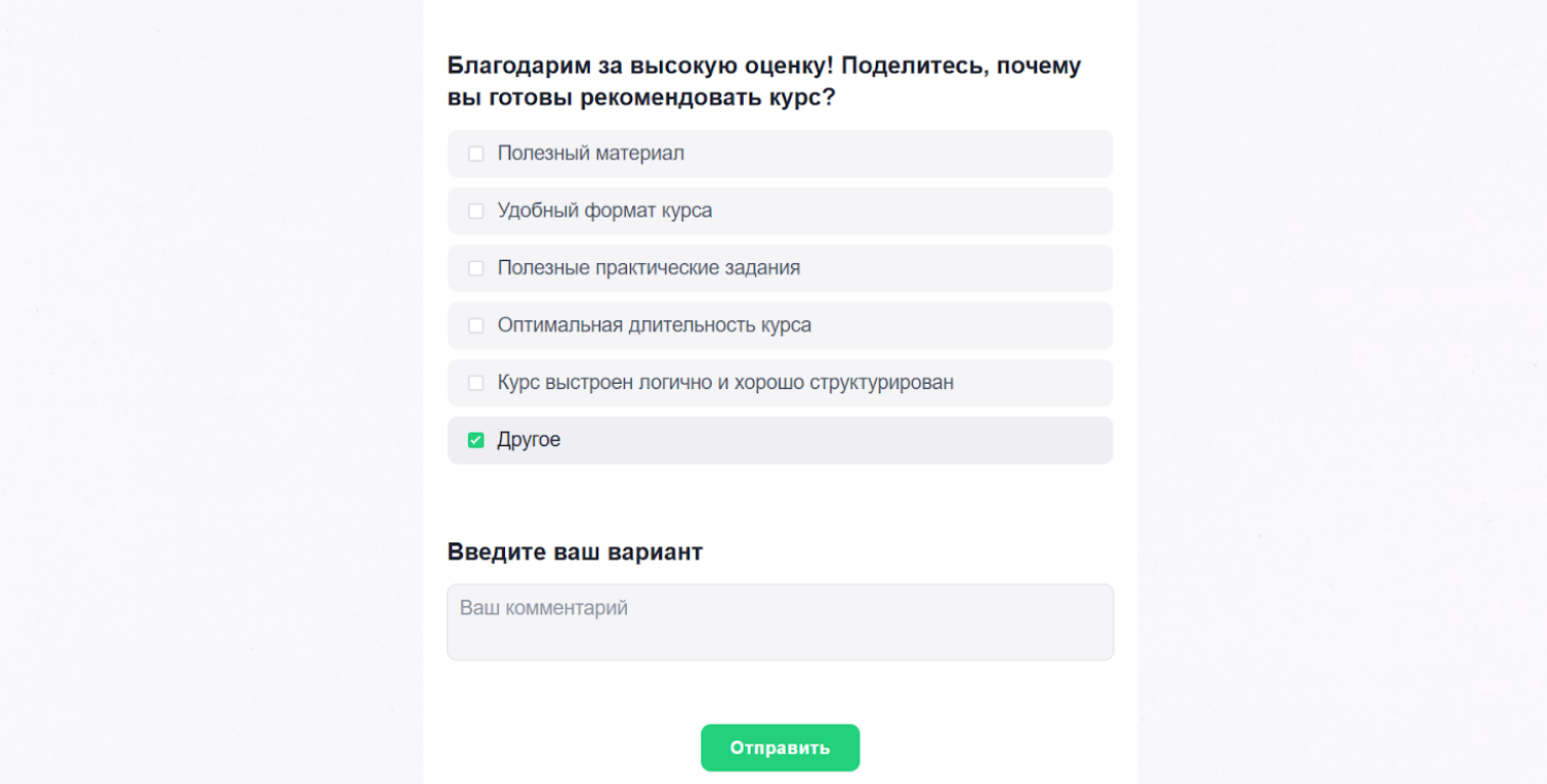 Мы обсуждали с командой, насколько нам важна стопроцентная проходимость после курса, от чего мы готовы отказаться, и где мы готовы пойти на риски. Решили, что нам максимально важно, чтобы опрос по ссылке также был обязательным для прохождения, и человек не уходил со страницы курса.